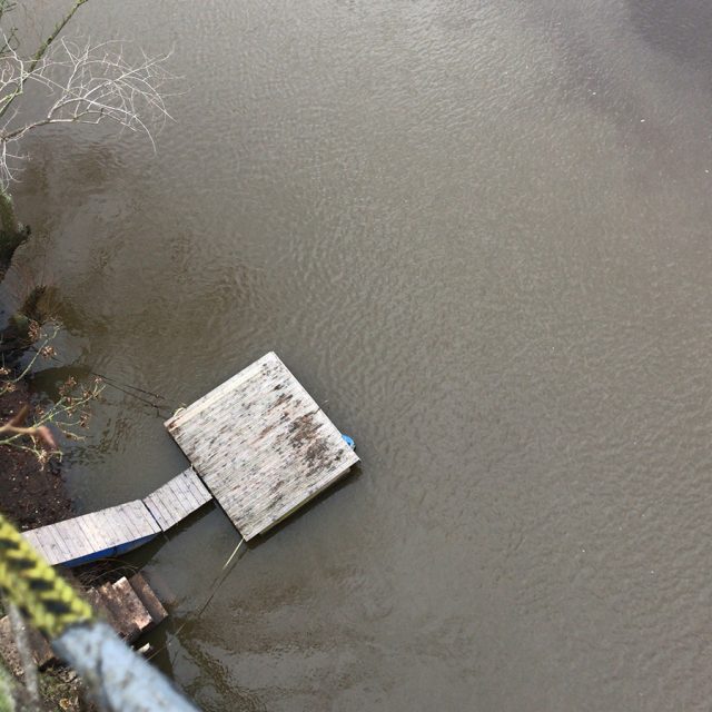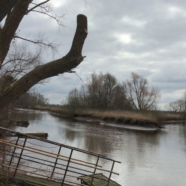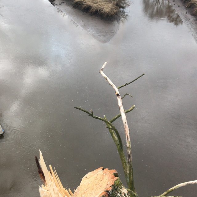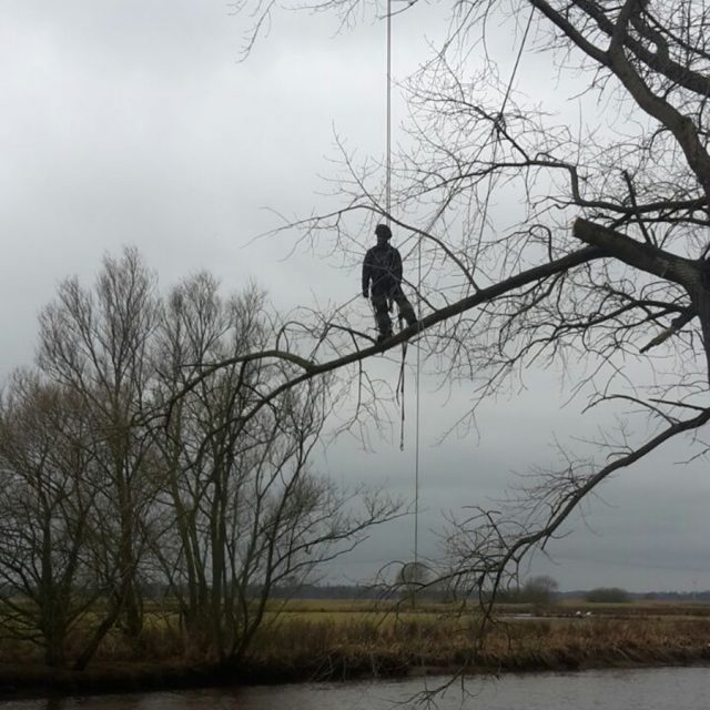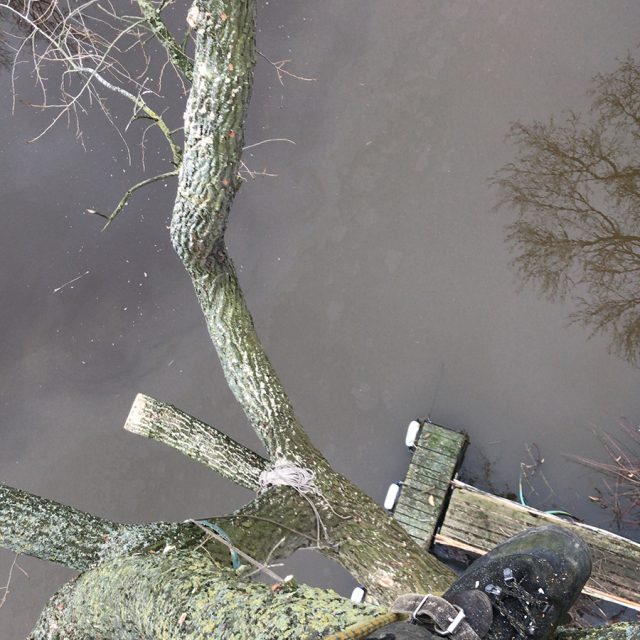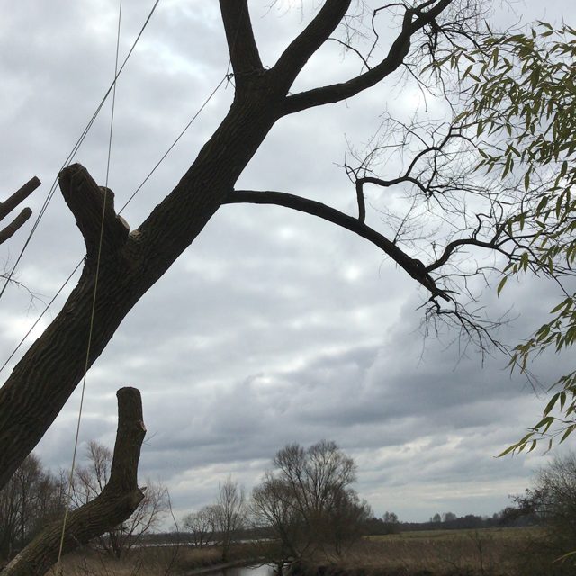 Fällung einer ca. 30 m hohen Pappel, die wachstumsbedingt mit einem extremen Schrägstand über die Ochtum gewachsen war
